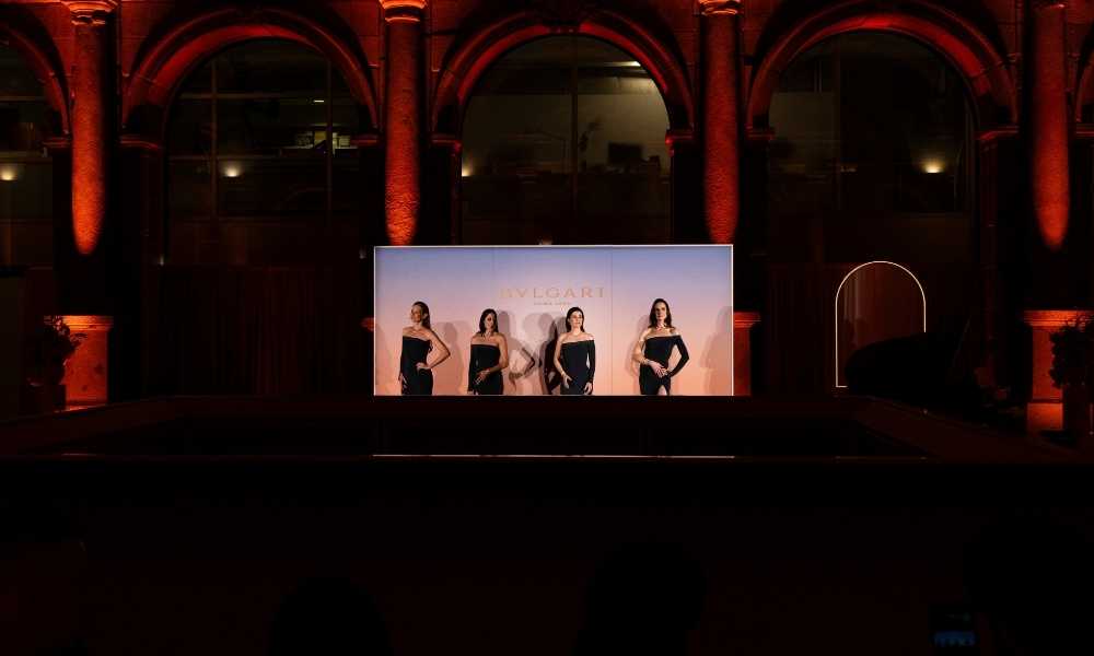 Para la cena, el histórico Claustro de los Jerónimos se transformó por completo bajo la luz rosada y la noche continuó avanzando con performances que elevaron aún más la atmósfera. Bailarinas desfilando con piezas icónicas de Bvlgari, un coro en directo y la actuación de las reconocidas cantantes italianas DIV4S, llenaron el claustro de un repertorio lírico y operístico.